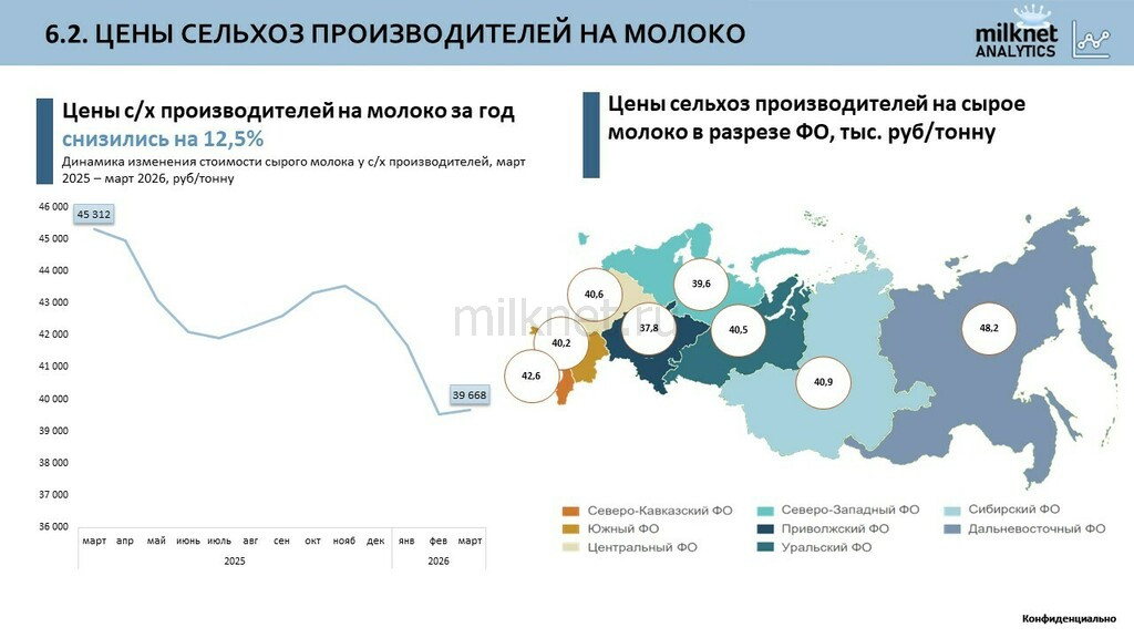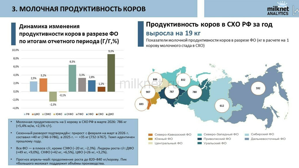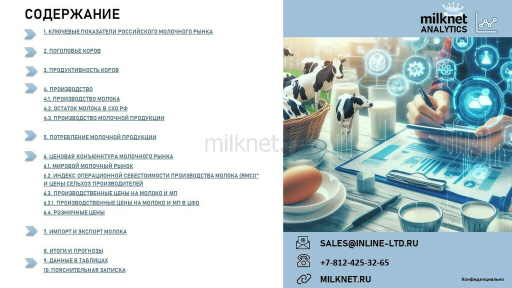 Информационно-аналитический отдел портала Milknet.ru представляет своим подписчикам 25-й ежемесячный аналитический отчет о молочной отрасли России по итогам марта 2026 года. В рамках исследования описана структура молочной отрасли России, обозначены тенденции и факторы ее развития, определен объем рынка, выделены существующие проблемы. Ежемесячный анализ позволяет вам быть всегда в курсе текущей обстановки в секторе, принимать взвешенные решения, опираясь на цифры. Каждый отчет содержит графики, информационные таблицы, а также инфографику (45-50 страниц).