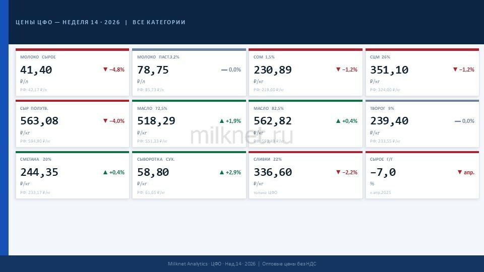 Четырнадцатая неделя 2026 года на молочном рынке Центрального федерального округа выдалась неоднородной. Рынок живёт в нескольких противоположных трендах одновременно: сырьё падает быстрее, чем по России в целом, масло уверенно восстанавливается, сыр несёт структурные потери от белорусского импорта, а сыворотка неожиданно даёт первый по-настоящему сильный разворотный сигнал за последние два месяца.