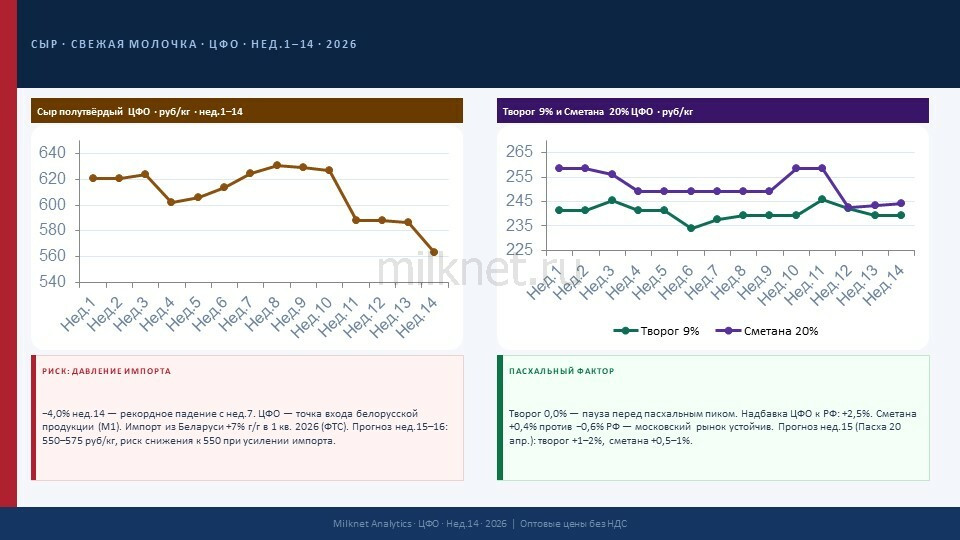 ЦФО живёт в своём ценовом цикле — более волатильном, более чувствительном к сезону и к белорусскому импорту, чем федеральный срез. Пасха 20 апреля даст краткосрочный импульс, аукцион GDT — среднесрочный ориентир. Главный риск ближайших шести недель — продолжение давления на сыр и сырьё.