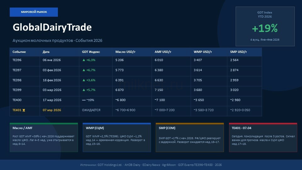 Масло — на противоположном полюсе. 72,5% прибавило +1,9% до 518,29 руб/кг, опередив федеральный тренд (+0,9%). Шестая неделя восстановления подряд. Дисконт ЦФО к среднероссийскому уровню сократился с 40 до ~33 руб/кг — признак конвергенции. Мировой аукцион GDT с начала года вырос на 19% за четыре события; российский рынок отыгрывает этот импульс с лагом 4–5 недель. Аукцион TE401 (7 апреля) — ключевой сигнал для прогноза.