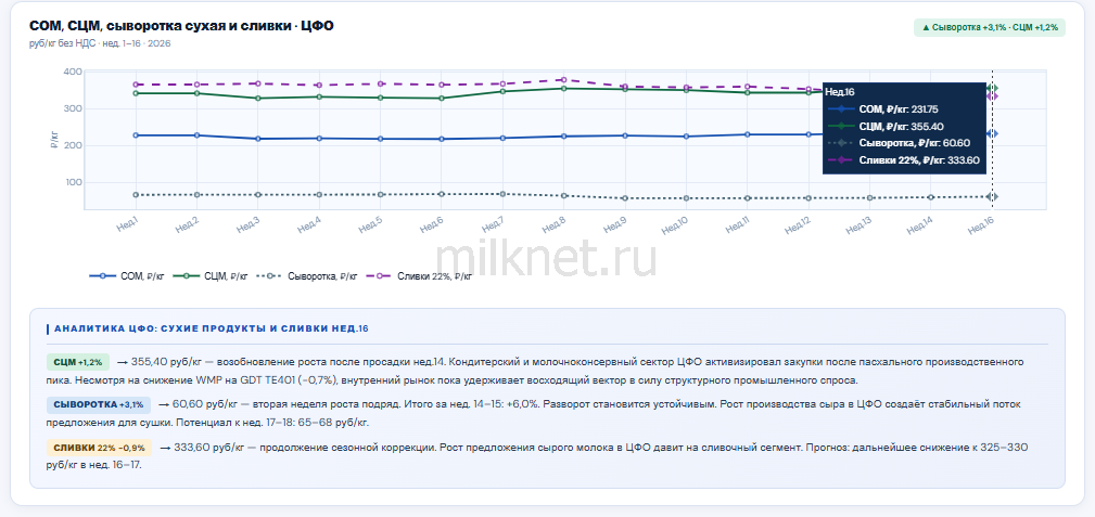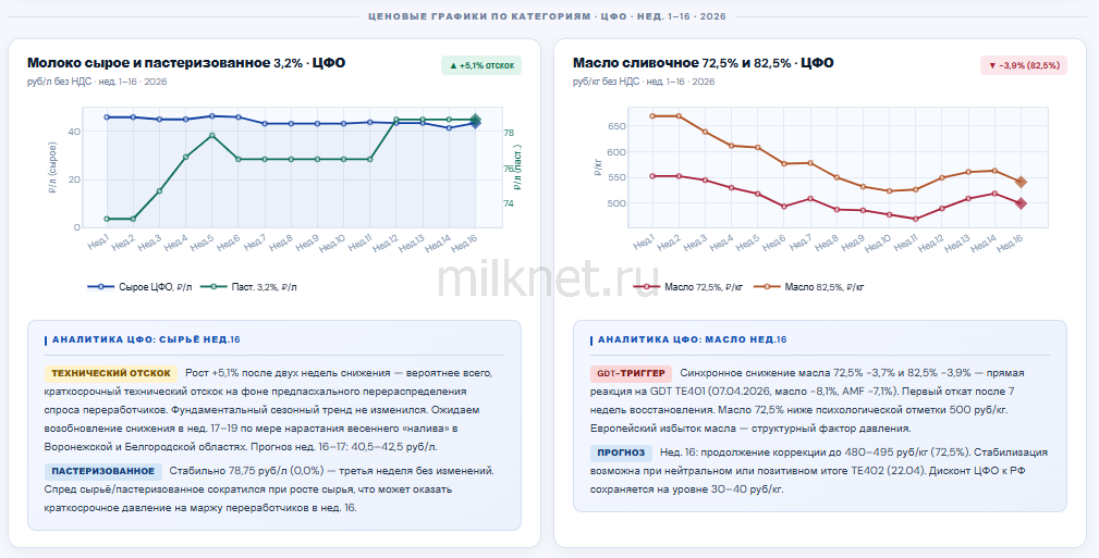 Шестнадцатая неделя принесла на рынок ЦФО постпасхальную неоднозначность. Сырьё вернулось к снижению, масло 72,5% обновило минимум года, а пастеризованное молоко выросло впервые за пять недель. При этом пасхальный спрос удержал сметану на высоте и дал сыру первую положительную неделю за месяц.
