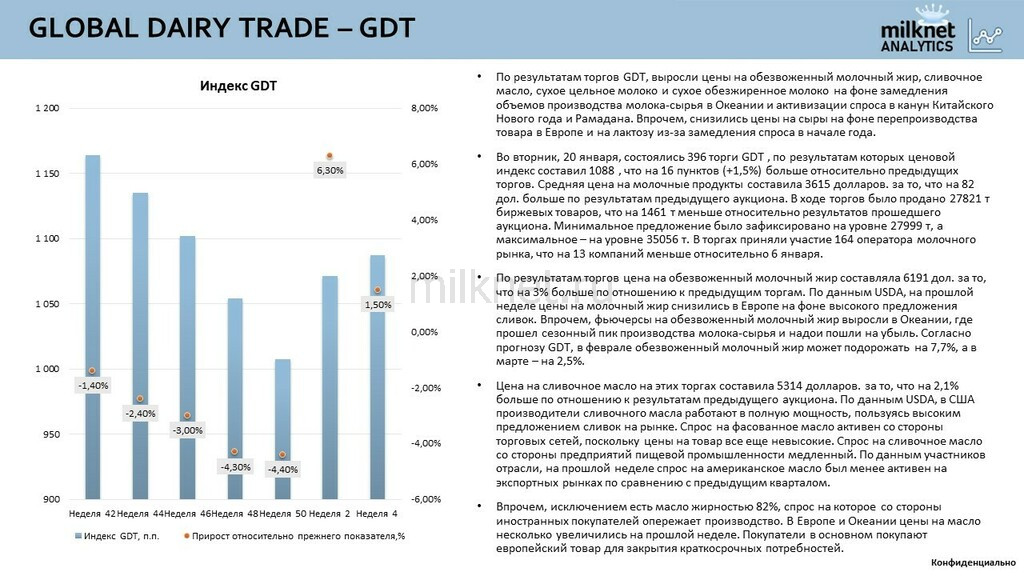 Во вторник, 20 января, состоялись 396 торги GDT , по результатам которых ценовой индекс составил 1088 , что на 16 пунктов (+1,5%) больше относительно предыдущих торгов. Средняя цена на молочные продукты составила 3615 долларов. за то, что на 82 дол. больше по результатам предыдущего аукциона. В ходе торгов было продано 27821 т биржевых товаров, что на 1461 т меньше относительно результатов прошедшего аукциона. Минимальное предложение было зафиксировано на уровне 27999 т, а максимальное – на уровне 35056 т. В торгах приняли участие 164 оператора молочного рынка, что на 13 компаний меньше относительно 6 января.