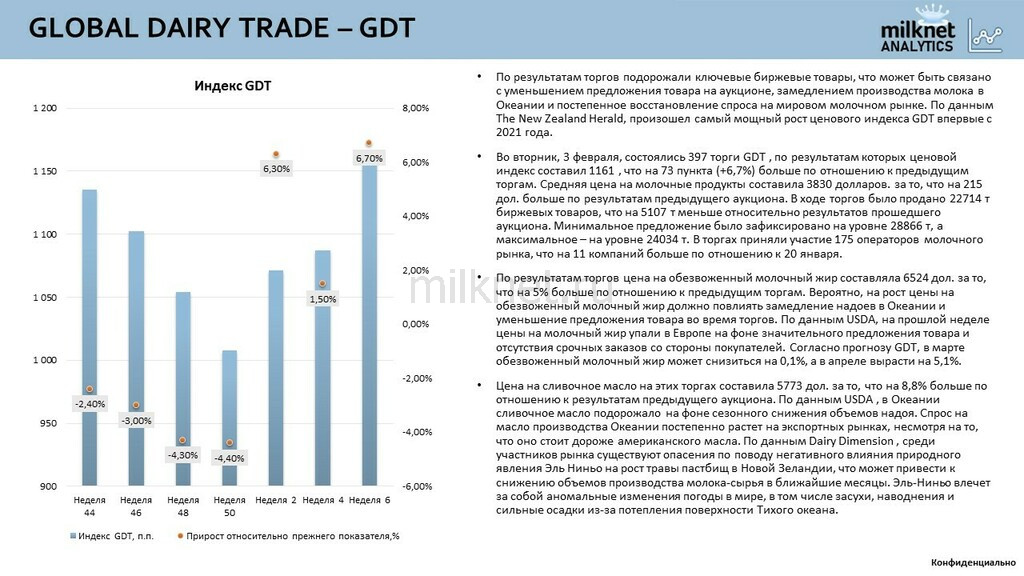 Во вторник, 3 февраля, состоялись 397 торги GDT , по результатам которых ценовой индекс составил 1161 , что на 73 пункта (+6,7%) больше по отношению к предыдущим торгам. Средняя цена на молочные продукты составила 3830 долларов. за то, что на 215 дол. больше по результатам предыдущего аукциона. В ходе торгов было продано 22714 т биржевых товаров, что на 5107 т меньше относительно результатов прошедшего аукциона. Минимальное предложение было зафиксировано на уровне 28866 т, а максимальное – на уровне 24034 т. В торгах приняли участие 175 операторов молочного рынка, что на 11 компаний больше по отношению к 20 января.