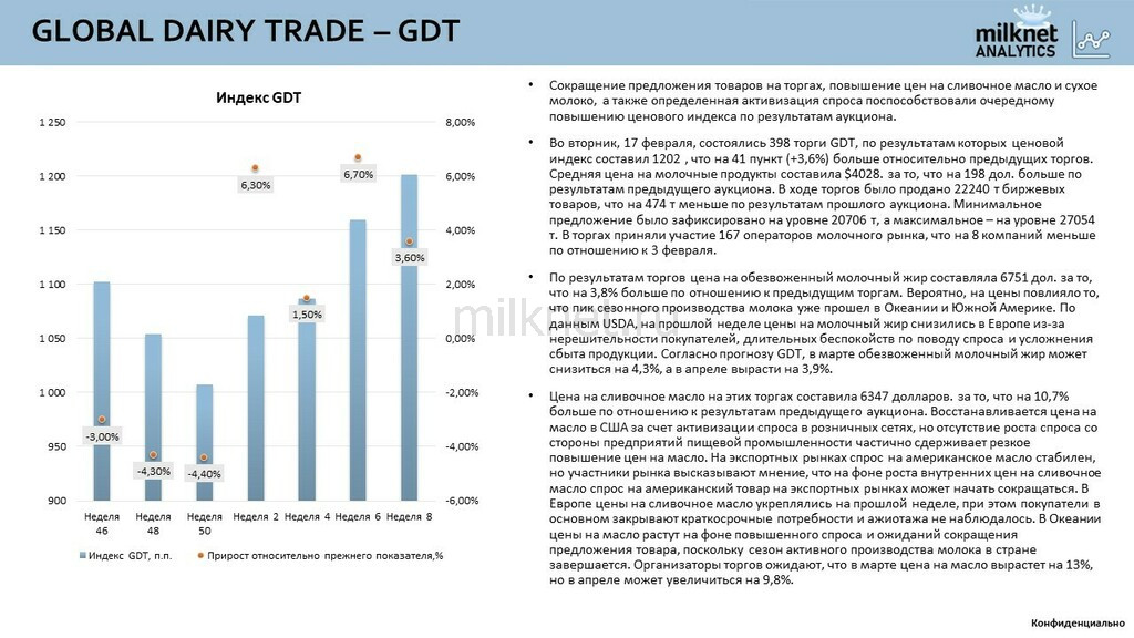 Во вторник, 17 февраля, состоялись 398 торги GDT, по результатам которых ценовой индекс составил 1202 , что на 41 пункт (+3,6%) больше относительно предыдущих торгов. Средняя цена на молочные продукты составила $4028. за то, что на 198 дол. больше по результатам предыдущего аукциона. В ходе торгов было продано 22240 т биржевых товаров, что на 474 т меньше по результатам прошлого аукциона. Минимальное предложение было зафиксировано на уровне 20706 т, а максимальное – на уровне 27054 т. В торгах приняли участие 167 операторов молочного рынка, что на 8 компаний меньше по отношению к 3 февраля.