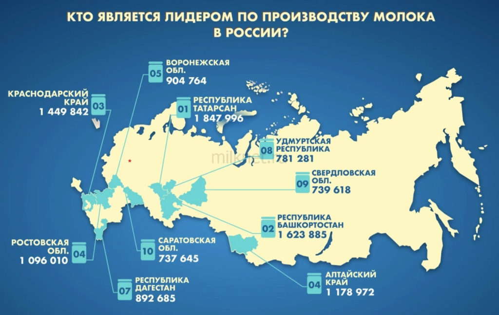 Всего за прошедший год в России было произведено более 30,6 миллионов тонн молока, что на 2,7% (0,85 млнлионов тон) меньше, чем в 2018.