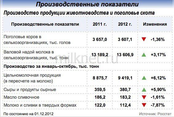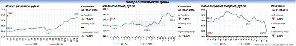 К началу 2013 года средняя цена закупки сырого молока у производителей составила 15,6 руб./л. Средняя потребительская цена на молоко разливное составила 30,8 руб./л (+1,0% за 2 недели), масло сливочное – 239,8 руб./кг (-1,5% за 2 недели), сыры сычужные твердые – 255,7 руб./кг (–0,9% за 2 недели).