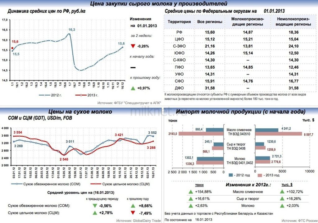 По состоянию на 16.01.2013, по данным GDT, средняя цена по итогам торгов на сухое обезжиренное молоко составила 3 552 USD/т (-0,6 % за 2 недели), на сухое цельное молоко – 3 288 USD/т (+2,8% за 2 недели).